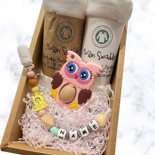 Muslin Swaddle with Customised Wooden Teether Gift Set