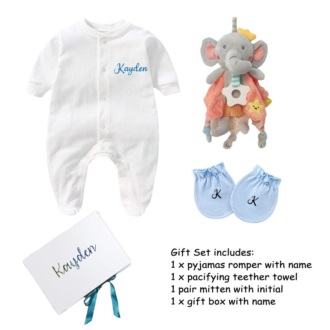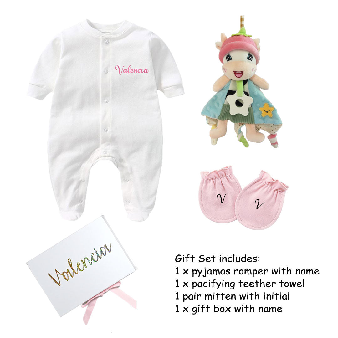 Set includes 1 x Pyjamas Romper, 1 x Pacifiying Teether Towel (4 designs to choose from), 1 Pair Mitten, 1 Giftbox